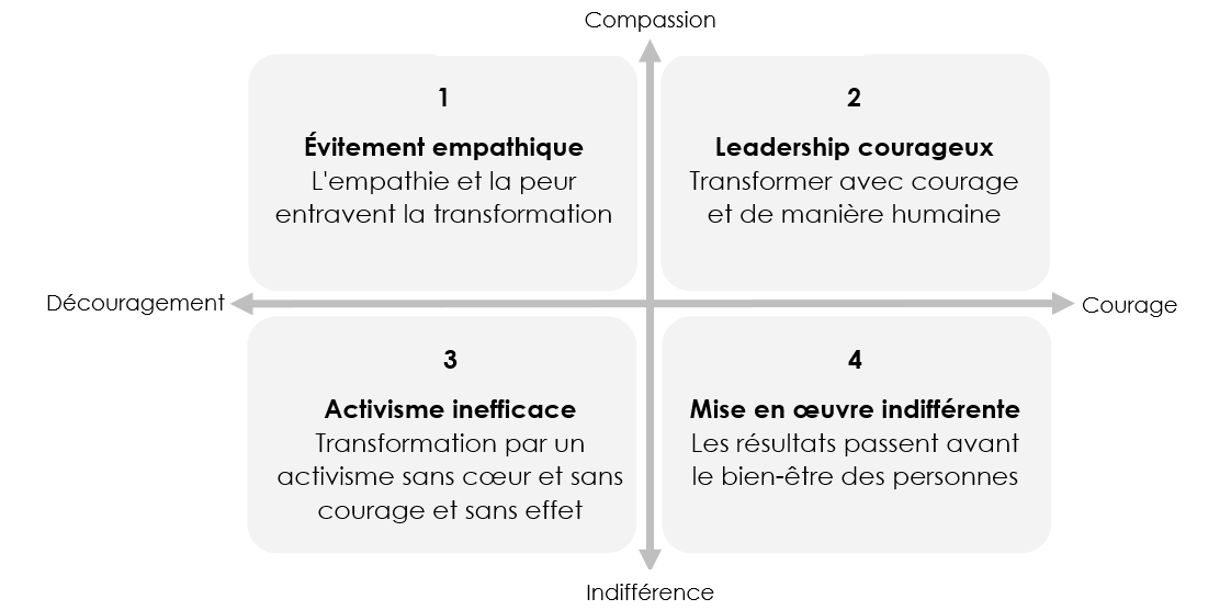 De nombreux changements échouent parce qu’ils sont abordés sans courage. Pour changer les choses, il faut allier compassion et capacité d’action, cœur et colonne vertébrale. Or, il arrive souvent que les dirigeants manquent de leadership courageux, ce qui les amène à faire preuve de beaucoup d’activisme, mais à peine à se transformer. Le leadership courageux peut nous aider à changer cela.