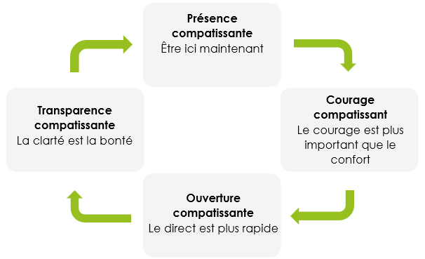 Comment les cadres peuvent-ils réussir à passer au champ 2 du leadership courageux ? Rasmus Hougaard et Jacqueline Carter proposent dans leur livre « Compassionate Leadership » un chemin en quatre étapes :